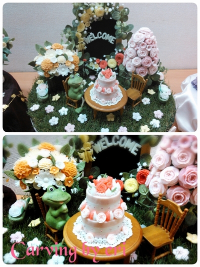今回は、ショーウインドウにフルーツカービングの展示をしました。テーマはWedding❤