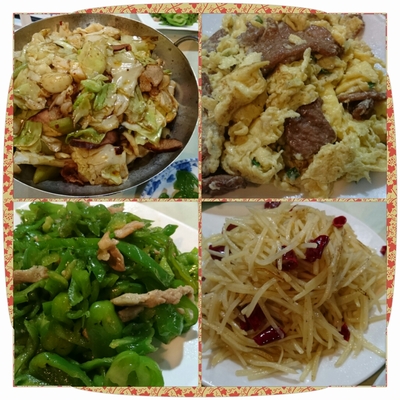 回鍋肉みたいな鍋と、牛肉と卵炒め、青椒肉絲(ピーマンが多い)ほとんどピーマンです。