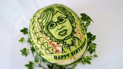 私は、似顔絵入りのフルーツカービングをプレゼント!とっても喜んでくれました。